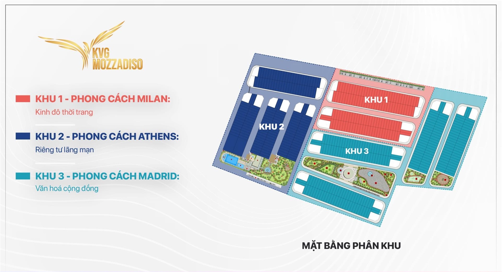 - Gồm 3 phân khu: Milan (126 căn), Madrid (222 căn), Athens (176 căn)