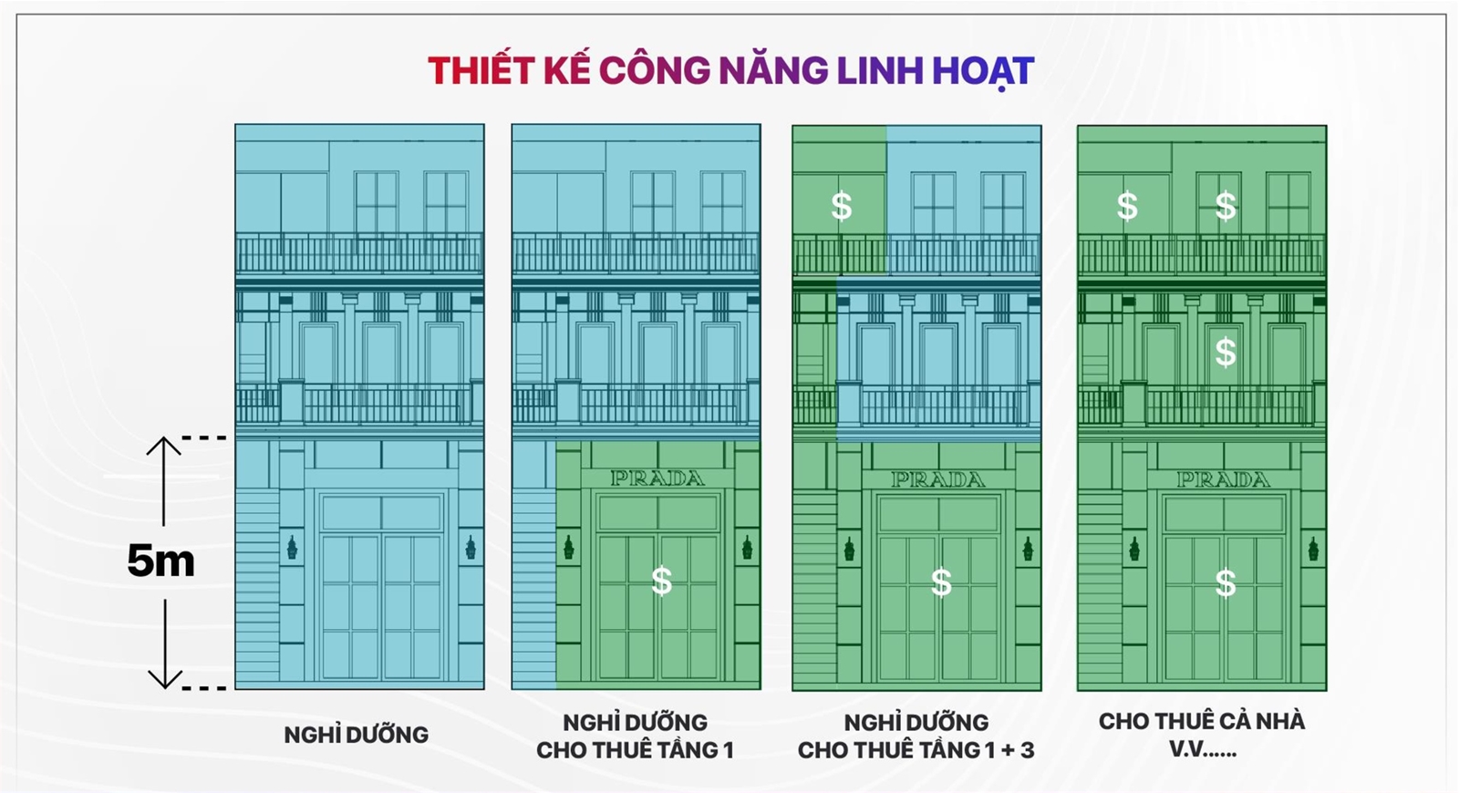 Các căn shophouse KVG Mozzadiso Nha Trang đều “chạm” tối đa công năng với thiết kế 3 tầng và 1 lửng cùng cầu thang độc lập với mái che riêng giúp gia chủ khai thác tài sản tối ưu nhất vừa kinh doanh – vừa cho thuê – vừa nghỉ dưỡng trong không gian riêng tư cho cả gia đình.